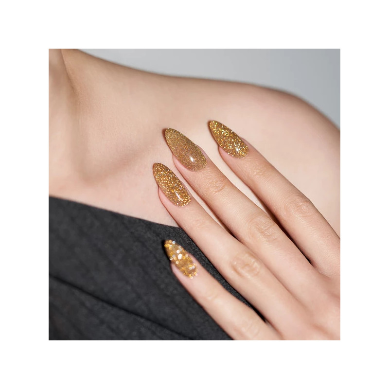 Caviar gel polish vous envoutera avec ses paillettes dorées et holographiques.