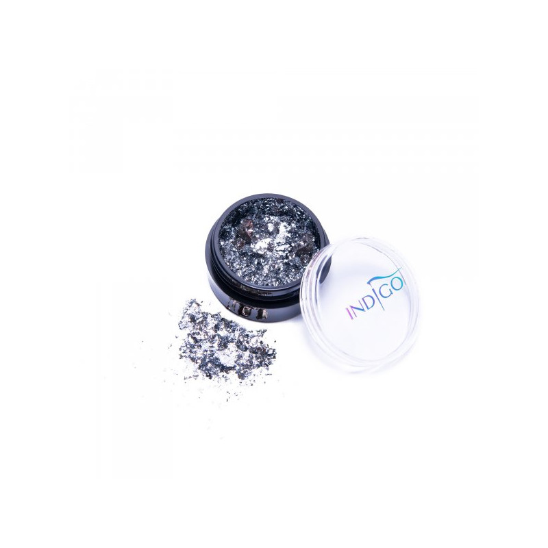 flakes voor decoraties in de vorm van kleine glinsterende bloembladen in een donkere zilveren tint. Hiermee kunt u het effect bereiken van een onregelmatige zilverfolie ook wanneer u het toepast op bepaalde stijlen, wordt het de perfecte aanvulling op meer delicate nailart.