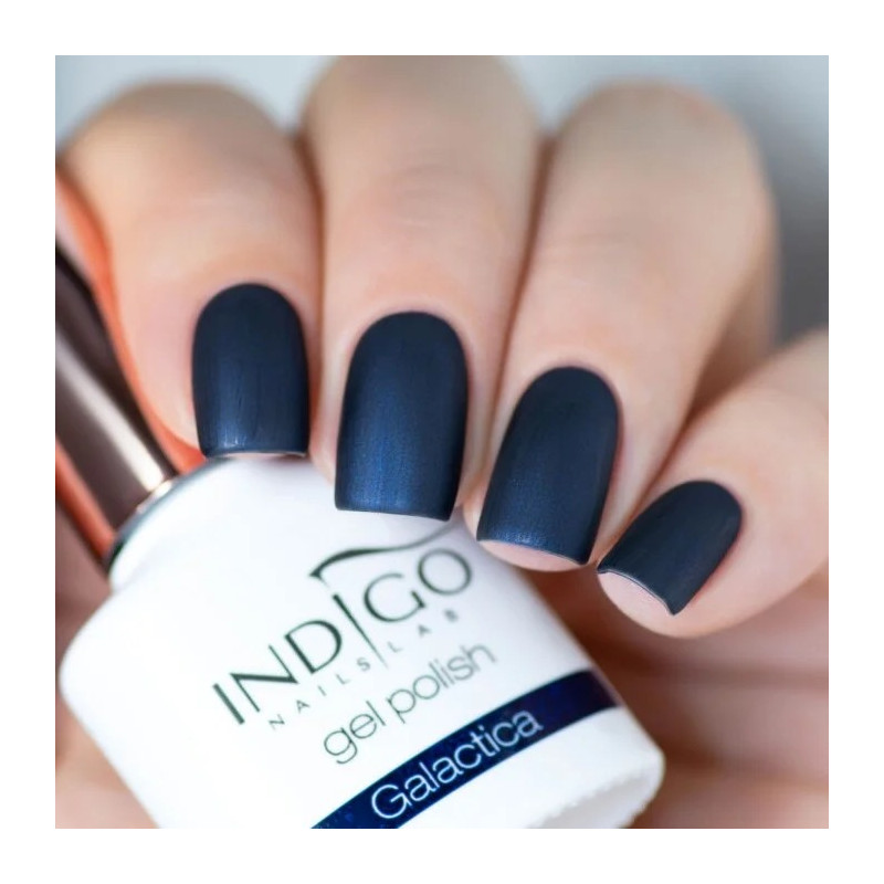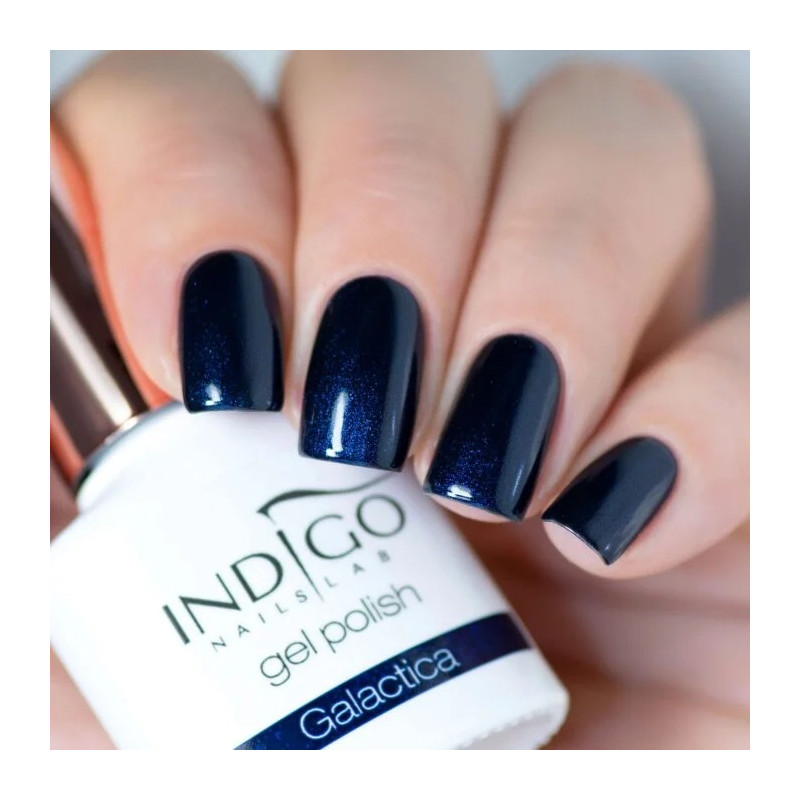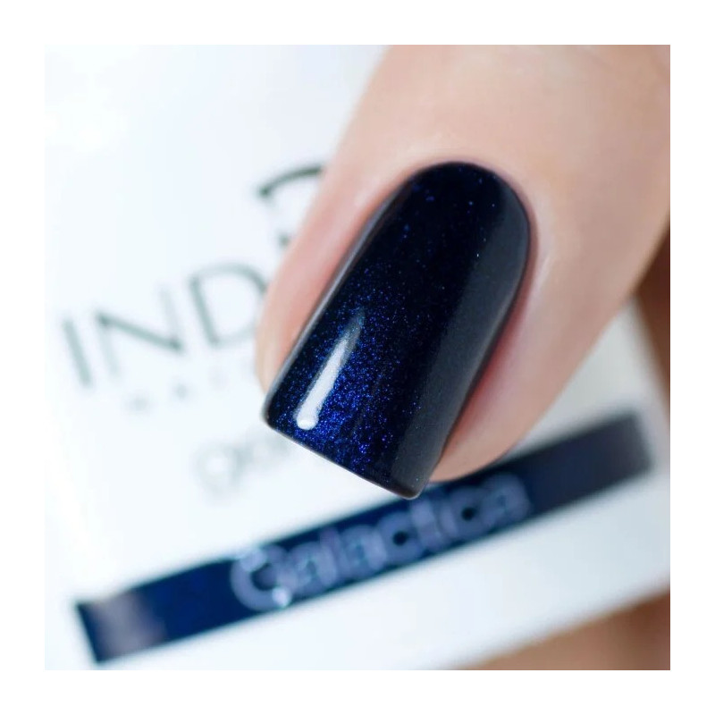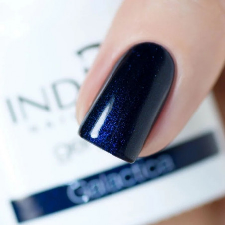 Maak je klaar om te stijgen. De Galactica gelpolish van Indigo Nails is een diep nachtblauwe kleur bezaaid met blauwachtige microdeeltjes, als een snufje sterrenstof gevangen in een melkwegstelsel. Een mysterieuze en magnetische tint, ideaal voor wie een intense en unieke manicure wil.