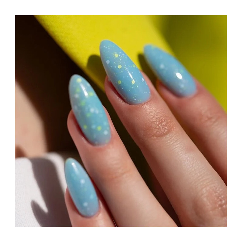 Ontdek Salvadore Bali Mineral Base, een elektrisch blauwe kleur met witte en neongeel/groene hexagonale deeltjes. Deze gewaagde, levendige mix voegt zeker een heldere, extravagante look toe aan uw zomerse stijlen.